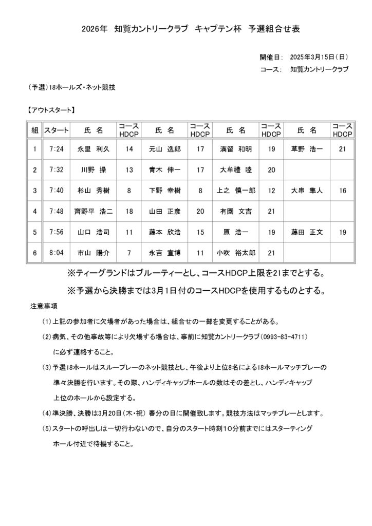 2026年 知覧カントリークラブ キャプテン杯 予選 組合せ